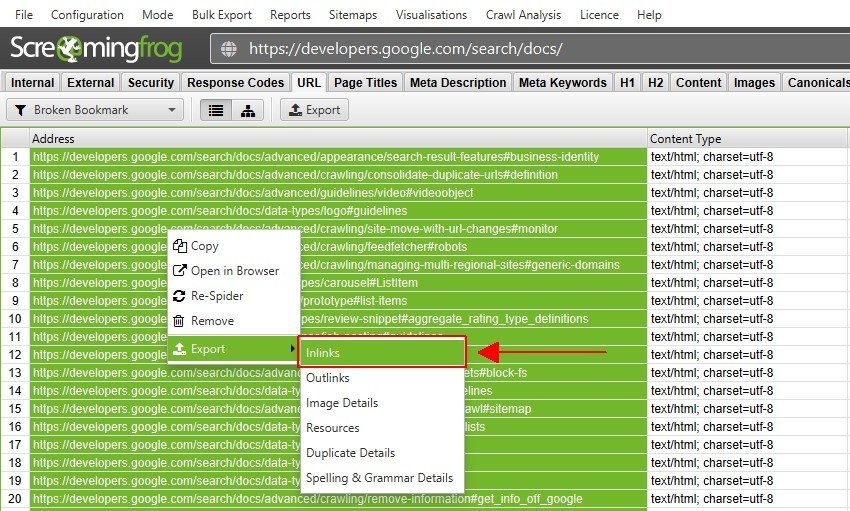 Ora non ti resta che scaricare in blocco i risultati includendo sia gli URL “sorgente” che le pagine dei segnalibri interrotti evidenziando tutti gli URL nella finestra superiore e cliccando con il tasto destro per selezionare il report “Inlinks”.