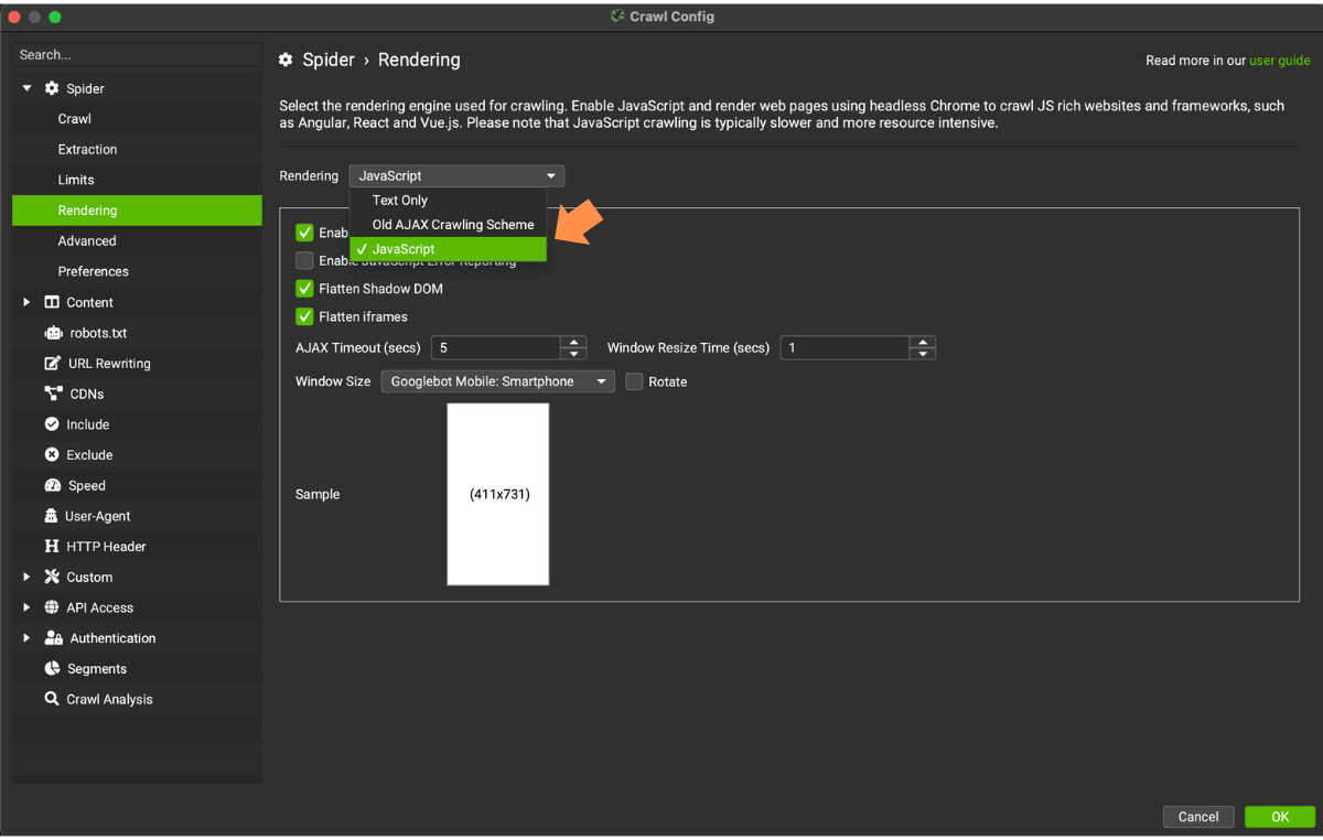 La dimensione della finestra di default è impostata automaticamente su Googlebot Smartphone, ma questo può essere regolato su desktop se ci sono differenze nel modo in cui il sito emette i cookie.