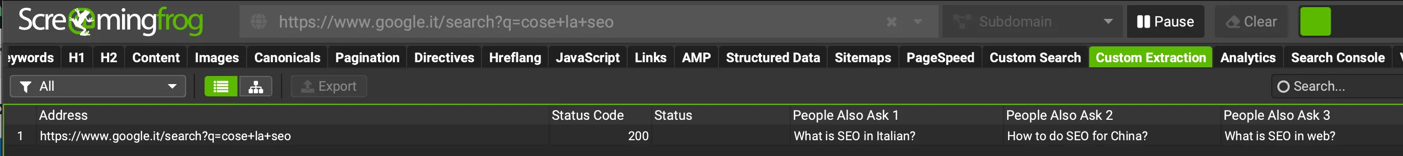 L’obiettivo di questo test sarà quello di estrarre i dati relativi a “People also Ask” dalla serp. La nostra query di riferimento sarà: “Cos’è la Seo“.