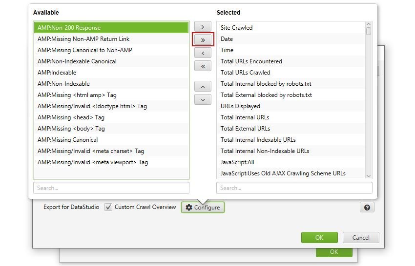 In questo pannello potrai personalizzare le informazioni del report “Overview” che desideri includere nell’esportazione di Google Sheets. Per impostazione predefinita, ti consiglio di selezionare tutte le metriche disponibili e aggiungerle alla casella selezionata sul lato destro. Questo può essere fatto istantaneamente facendo clic sulla doppia freccia a destra.
