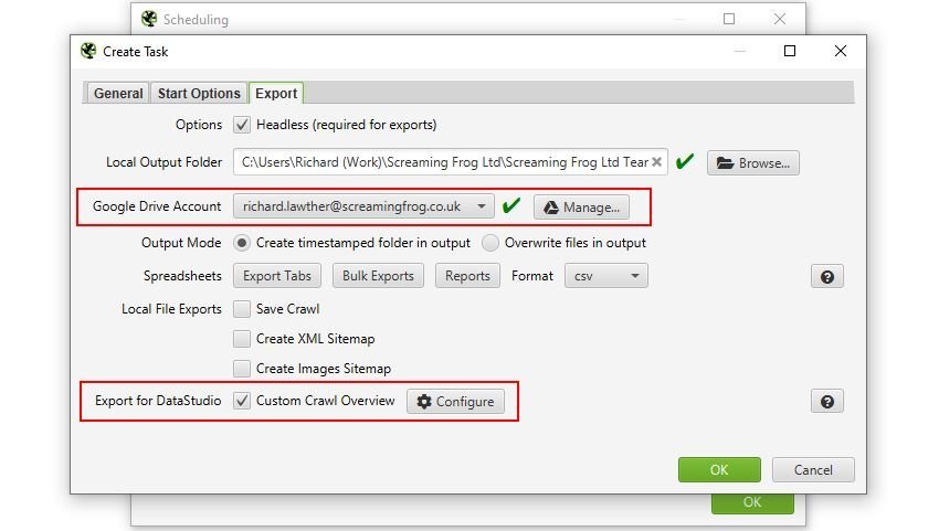 Collegando una scansione programmata scadenzata ad un account di Google Drive il Seo Spider può aggiornare i dati del report Overview dopo ogni singolo crawl permettendoti di integrare i dati e dare una storicità alle tue analisi.