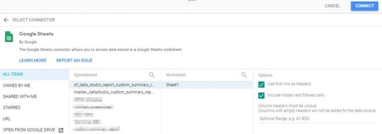 Nuova sorgente dati per data studio - connettore Google spreadshhet
