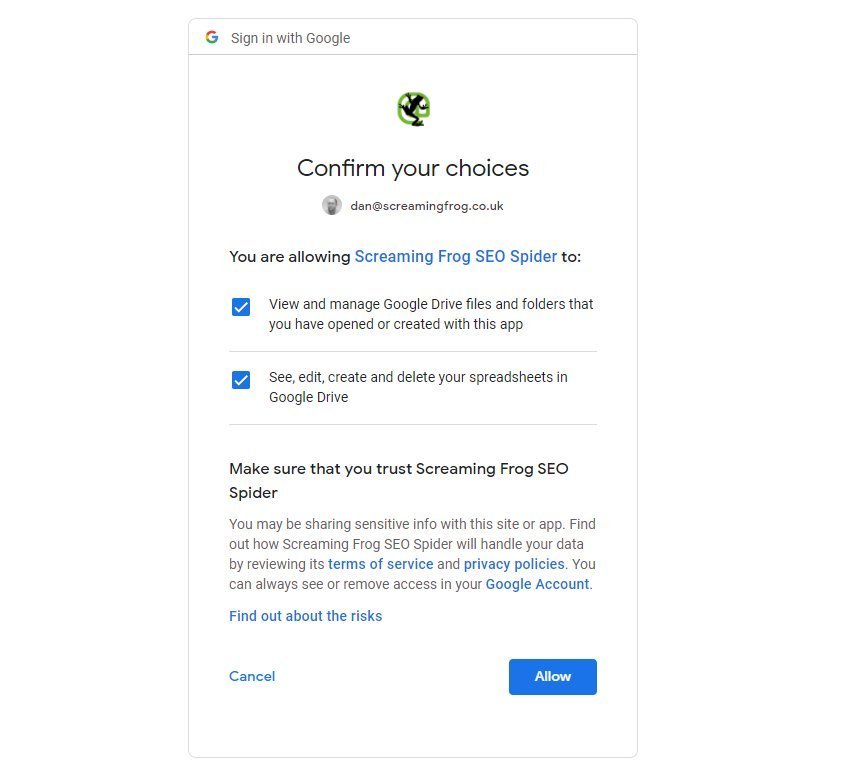 Seleziona il tuo account Google dal menu a tendina o, se non hai ancora utilizzato il salvataggio su Google Drive, seleziona “Manage” e “Add”. Per completare questa fase sarà necessario autorizzare Screaming Frog ad accedere all’account Google.