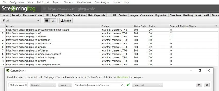 La ricerca precedente può essere anche ampliata a più parole utilizzando la stessa “Custom Search” e dividendo le singole RegEX con la “|” (Simbolo Pipe). Questa ricerca di permette di valutare la densità delle query nel testo e di evitare eventuali penalizzazioni di overstuffing.