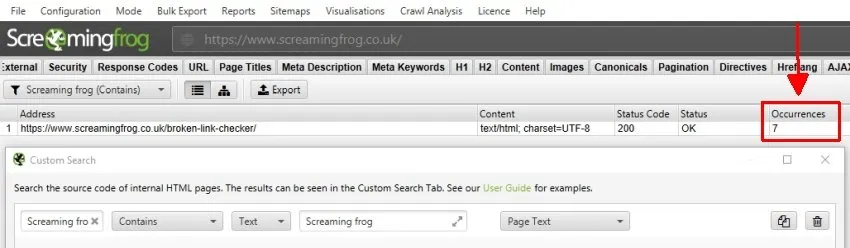 Ad esempio potremmo ricercare se il nome Screaming Frog è stato sempre scritto correttamente o presenta dei “Misspelling” negli articoli del blog. Nello specifico abbiamo interrogato il Seo Spider per verificare se il nome aziendale del Seo Tool sia scritto in modo corretto o presenti la lettera minuscola ad inizio della seconda parola: “Screaming frog”.