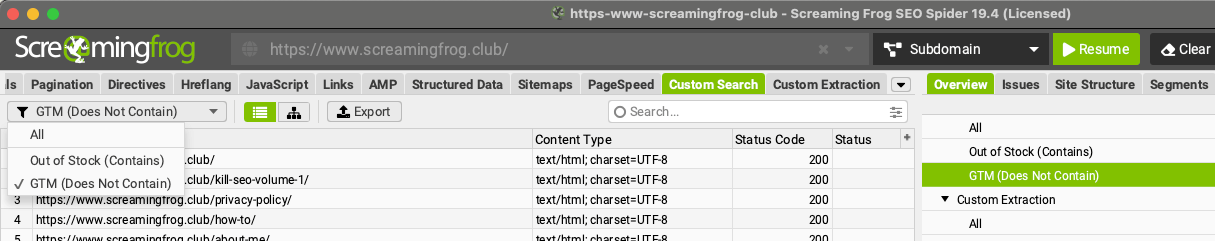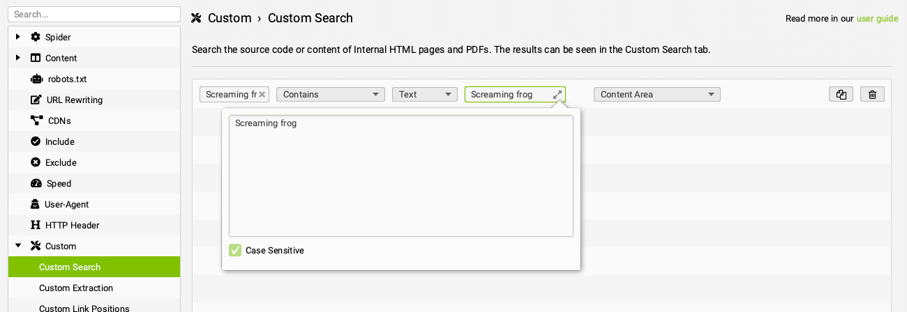Il Seo Spider ti permette di verificare la presenza di qualsiasi elemento contenuto nel codice sorgente delle pagine di un sito web attraverso la funzionalità “Custom Search”. Per default il sistema ricerca l’HTML raw mentre passando alla modalità di scansione “Javascript Rendered” ti permette di estrapolare anche il dato renderizzato. Il tool consente di configurare fino a 100 ricerche personalizzate che ti restituiscono URL che contengono o non contengono l’input ricercato.