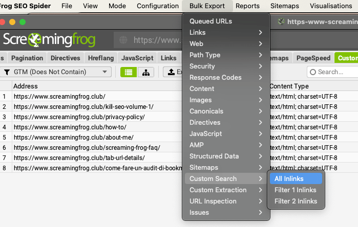 Per completare l’analisi puoi esportare i risultati cliccando direttamente sul tasto “Export” della scheda o usare la funzione “Bulk Export” per ottenere tutti gli Inlinks della tua ricerca personalizzata.