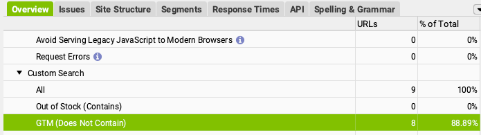 - la definizione delle pagine in cui manca lo script di Google Tag Manager (Does Not Contains)