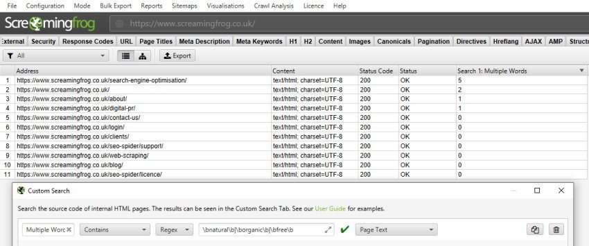 La ricerca precedente può essere anche ampliata a più parole utilizzando la stessa “Custom Search” e dividendo le singole RegEX con la “|” (Simbolo Pipe). Questa ricerca di permette di valutare la densità delle query nel testo e di evitare eventuali penalizzazioni di overstuffing.