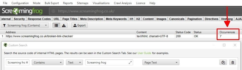 Ad esempio potremmo ricercare se il nome Screaming Frog è stato sempre scritto correttamente o presenta dei “Misspelling” negli articoli del blog. Nello specifico abbiamo interrogato il Seo Spider per verificare se il nome aziendale del Seo Tool sia scritto in modo corretto o presenti la lettera minuscola ad inizio della seconda parola: “Screaming frog”.