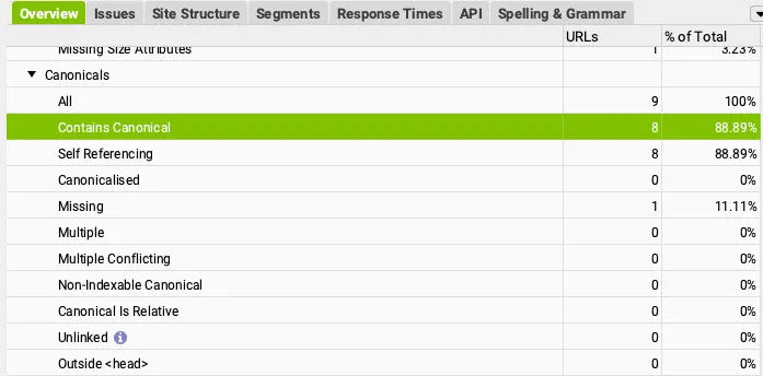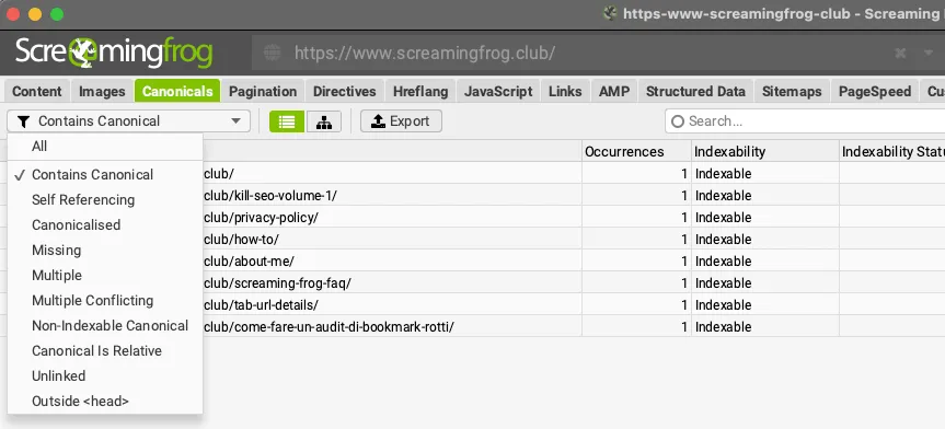 The ‘Occurences’ column counts the number of rel=”canonical” elements that were discovered for each individual URL.