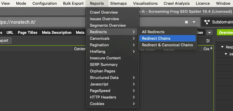 To always keep your website healthy I recommend you always use Screaming Frog which, in a simple and intuitive way allows you to view any redirect chains or loops in links through different reports in addition to the possibility of sidebar consultation in the “Overview” tab – “Internal- External” section.