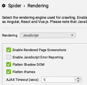 - 1. To scan a JavaScript website, open Seo Spider, click on ‘Configuration > Spider > Rendering’ and change ‘Rendering’ to ‘JavaScript’.