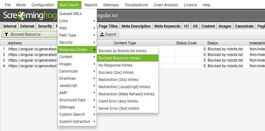 Blocked pages and individual resources can also be bulk exported with the report “Bulk Export > Response Code > Blocked Resource Inlinks to be unblocked and optimized.