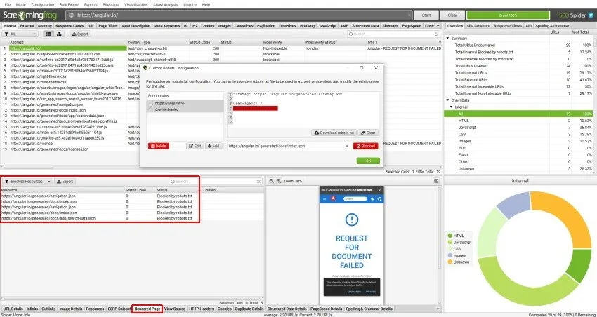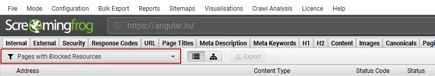 Blocked resources can also be viewed for each page within the ‘Rendered Page’ tab, adjacent to the rendered screen in the bottom panel of the window. In severe cases, if a JavaScript site completely blocks JS resources, then the site simply will not be scanned.