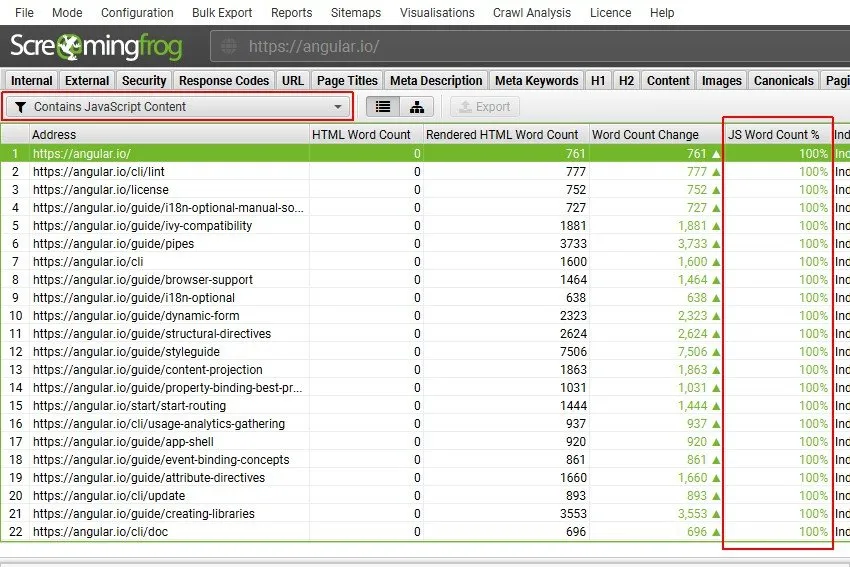 Another important check concerns links present only in the rendered text. Through the “Contains JavaScript links” filter, you can identify which hyperlinks are discovered after JavaScript is executed.