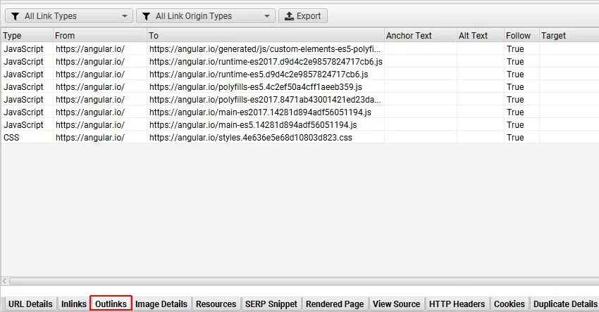 As you can also see the “Outlinks” Tab does not have hyperlinks since they are not rendered in the raw html and cannot be seen by the Seo Spider.