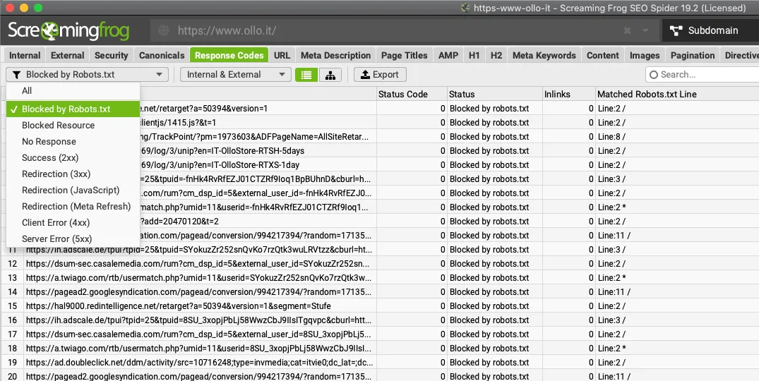 Screaming Frog, through the“Blocked by Robots.txt” filter, of the“Status Code” tab allows a view of all URLs affected by the file, and through the export, a reference document can be downloaded for possible checks or analysis.