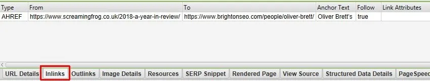 Here is a close-up view of the bottom pane of the window detailing the ‘inlinks’ data
