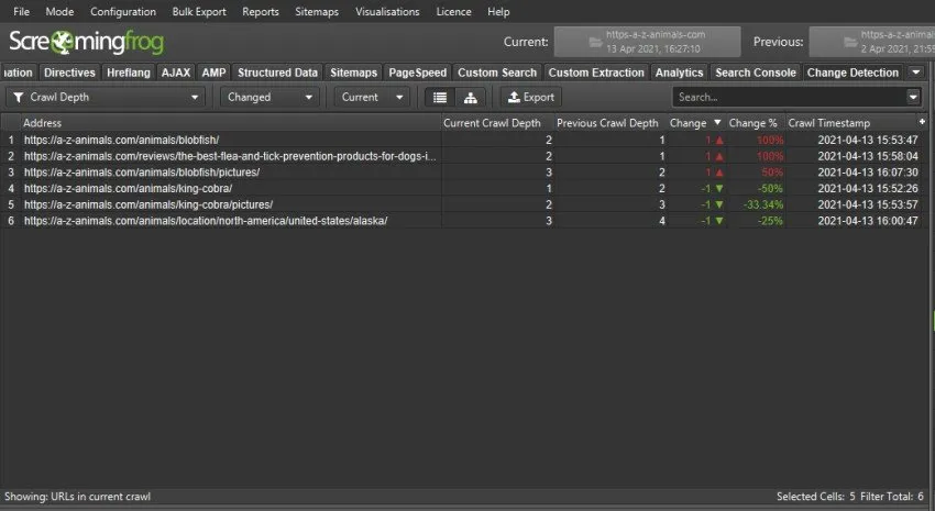 - Compare site structure and changes in directories, pages, and crawl depth between crawls.