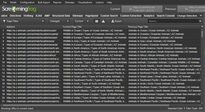 This is useful when an element has changed but has not activated a filter. For example, the title of a page might change completely, but this would not be detected if you did not activate a change filter such as ‘Missing’, ‘Over X Characters’, ‘Duplicates’ etc. Change detection with ‘Change Detection’ lets you know if there has been any change to an element or metric.