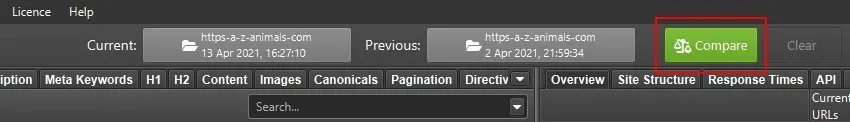 Simply click on “Compare” to start scanning between the two crawls according to the “Change Detection” configurations set earlier.