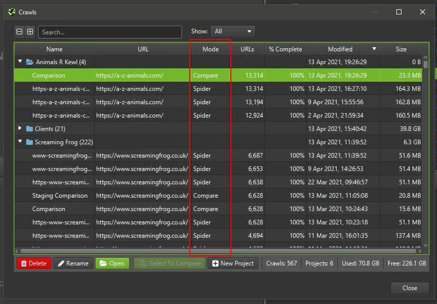 Once the comparison is complete the data will be saved automatically and you can use it again by going to “File > Crawls.”