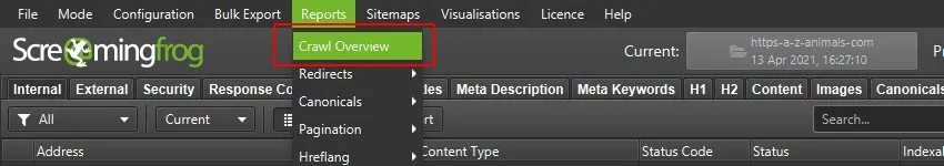 Data from the “Overview – Overview” sidebar can be exported with the “Crawl Overview” document.