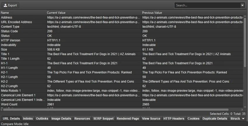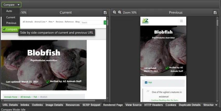 Another opportunity for comparison is to consult the lower window of the Seo Spider where you can view scan data by comparing them side by side.