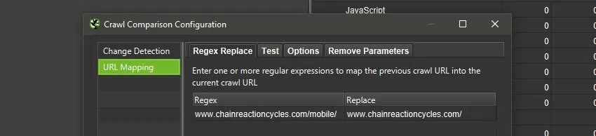 In the example above, the Chain Reactions Cycles website has a /mobile/ subfolder dedicated to the smartphone version, so to compare the mobile website with the desktop website, the mobile URLs were mapped to the desktop equivalent with the following URL Mapping.