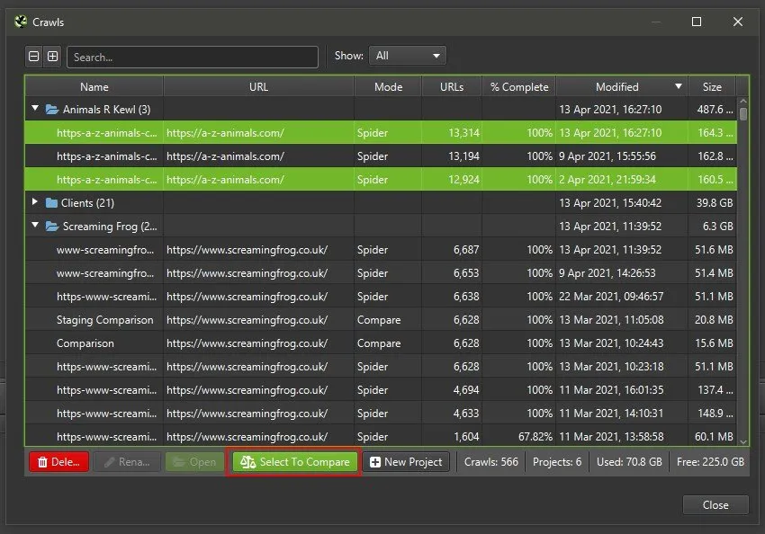 To begin the comparison, simply select the scans from “File > Crawls,” highlight the two crawls by holding down ‘control’ on Windows, or the ‘command’ key on macOS, and click on “Select to Compare,” to switch from “Spider or “List” mode to “Compare” mode