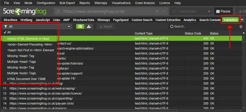 The Seo Spider will flag any pages with invalid <html> elements that might be problematic and any meta tags such as titles, canonicals or meta robots that are outside the header.