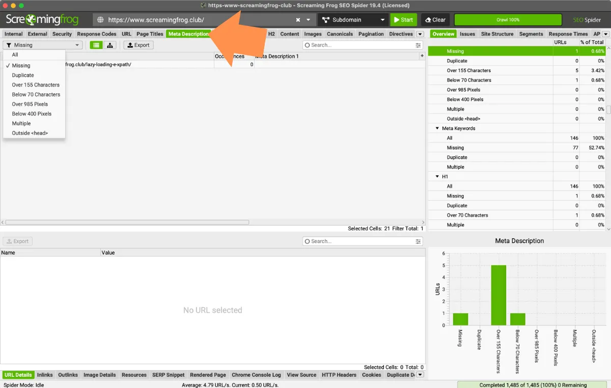 - Duplicate: all pages that have duplicate meta descriptions. It is very important to curate this tag to best communicate the purpose of each page. If they are duplicated or irrelevant, they will be ignored by Search Engines.