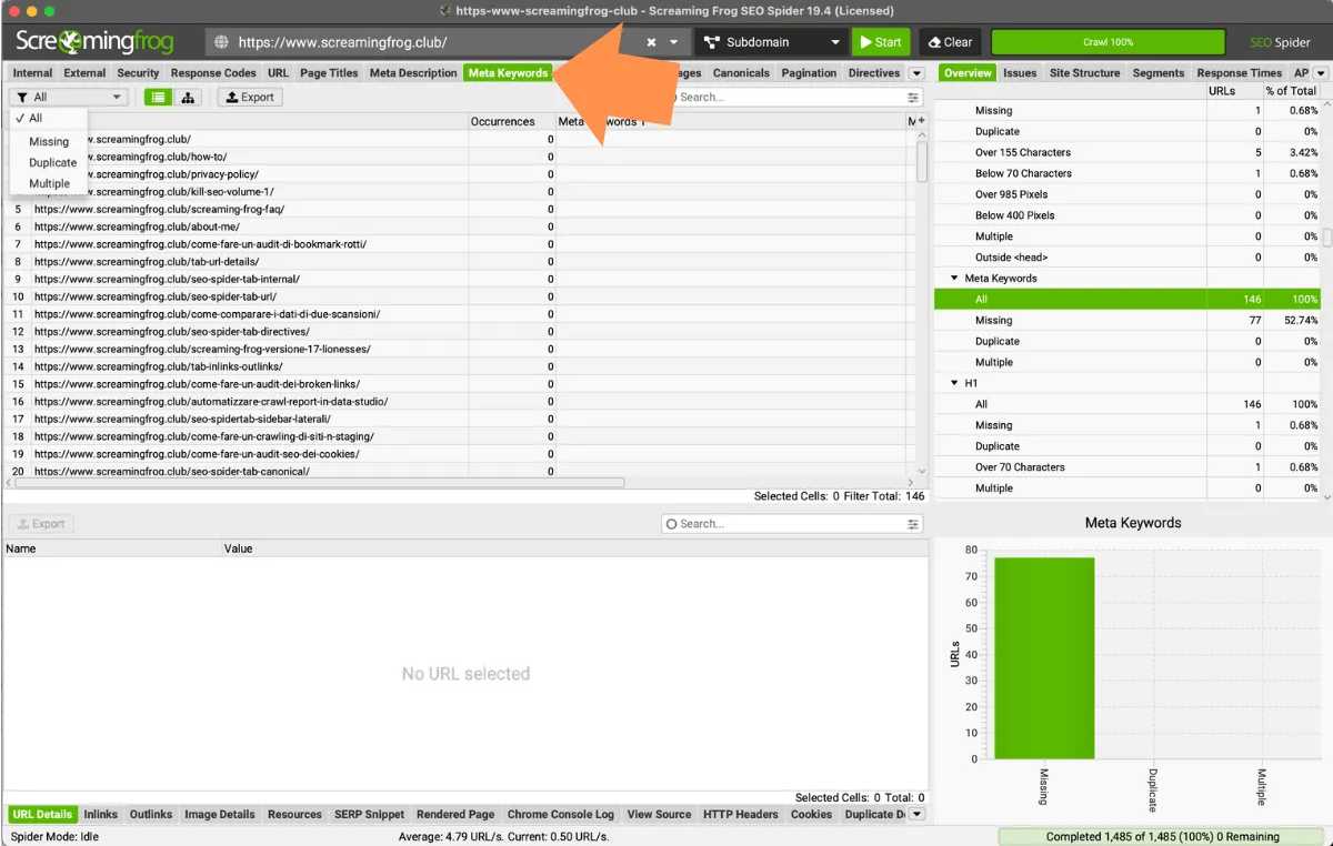 - Missing: displays all pages that do not have a Meta Title and allows you to find out which URLs need to be optimized. This tag participates in website ranking formation and helps improve CTR and related traffic. Its optimization allows you to prevent the Search Engine from independently choosing the title of pages with a high percentage of mispronunciations.