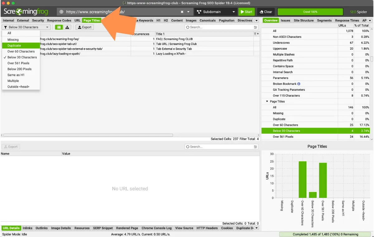 - Below 30 characters: identifies all pages that have page titles below 30 characters in length. This is not necessarily a problem at the Seo level, but an overly stringent Meta Title may be underpowered and not communicate Search Intent well.