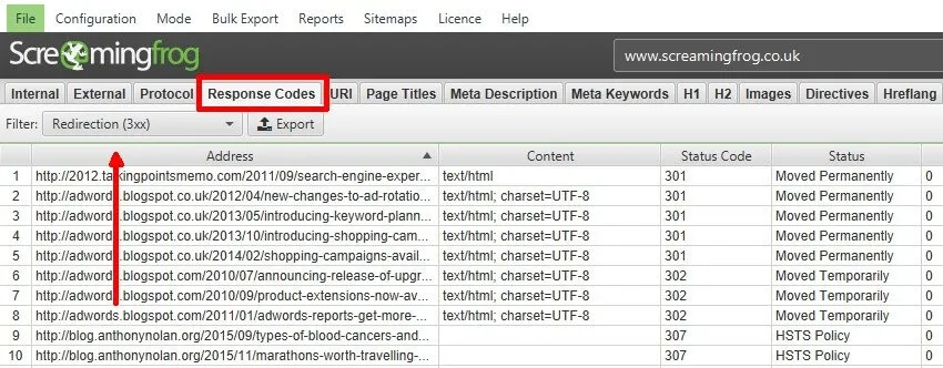 To examine the data you simply click on the “Response Code” tab and set the filter ‘Redirection (3XX)’.