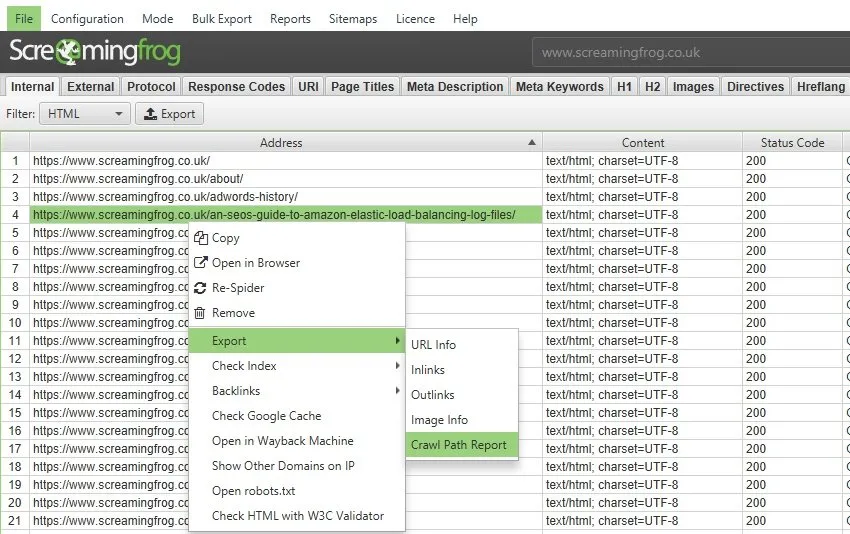 The document is available by right-clicking on a URL in the upper window of Seo Spider and selecting the “export” option.