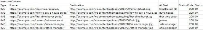 The “insecure Content” document presents you with all secure URLs (HTTPS) that have insecure elements with HTTP protocol such as internal links, images, JS, CSS, SWF or external images on a CDN, social profiles, etc.