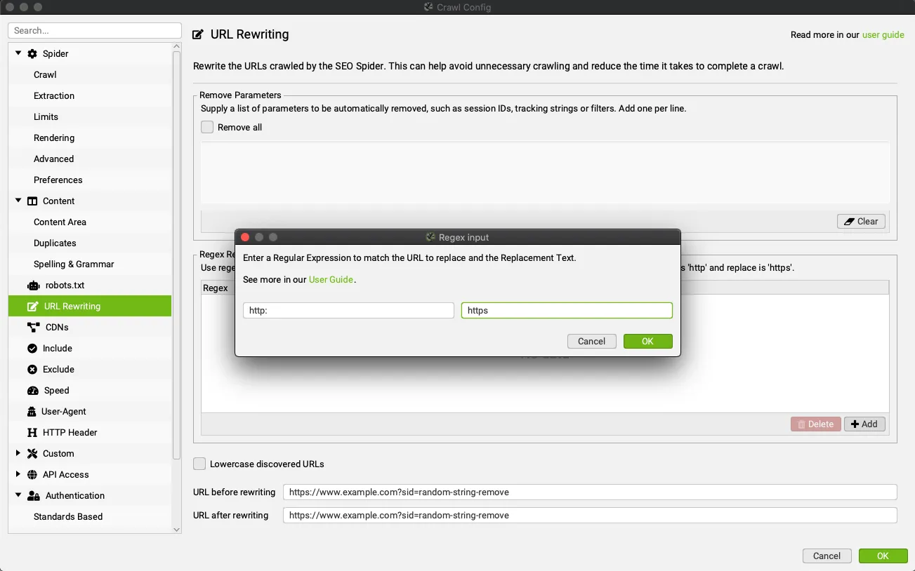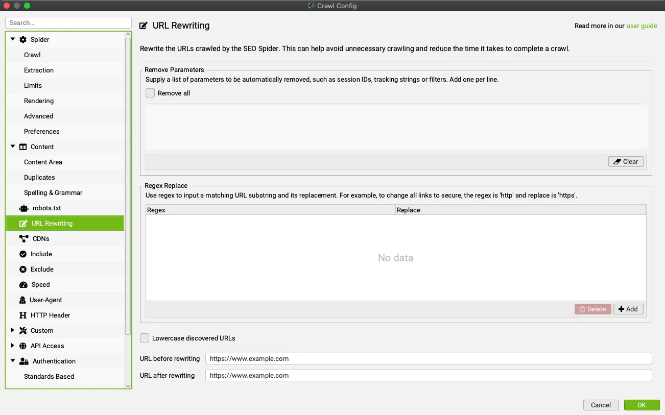 This advanced function is performed on every URL found during a crawl or in list mode. In a very simple way through the RegEX syntax you are able to replace every substring in a URL that matches the input with the chosen string. This option can also be tested in the “Test” tab of the “URL Rewriting” configuration window.