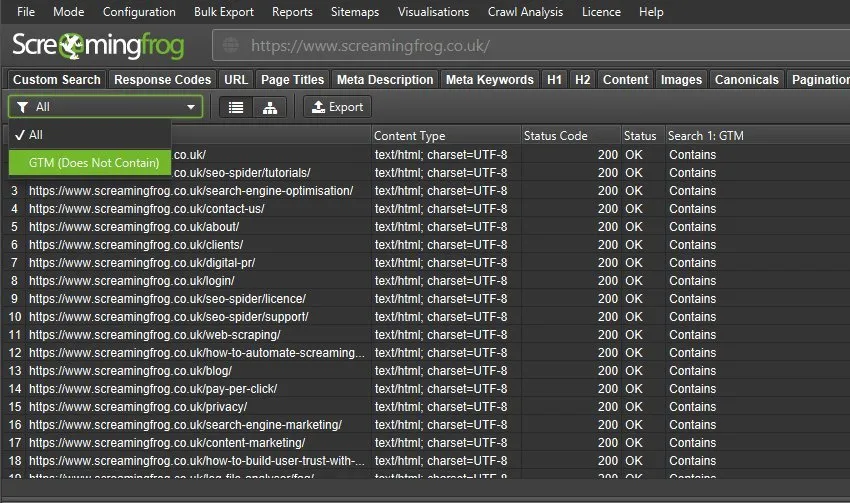 This way you can check for which URLs there is no tracking (Custom Search tab) in the main window of the Seo Spider.