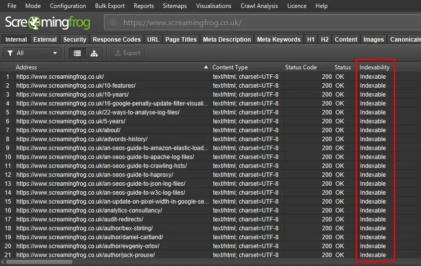 - Indexability Status: identifies the reason why the destination address is not indexable, for example, the presence of the “Noindex” tag.