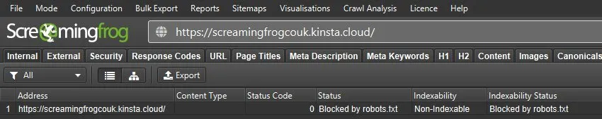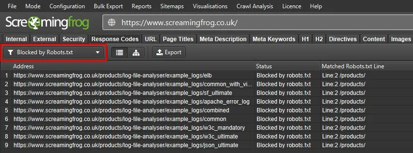 Upon publication, all you have to do is crawl the website to check that all pages on the site are “crawlable” and indexable and that it does not have important resources blocked by robots.txt (Response Codes > Blocked by Robots.txt)