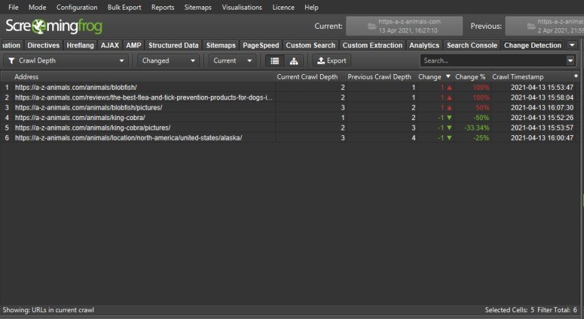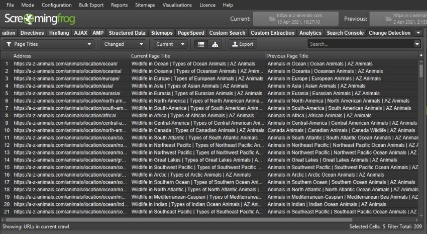 En el ejemplo anterior, hay un total de 2.236 URL existentes en ambos escaneos, 1 URL cambió el H1, 209 URL cambiaron el título de la página, 6 cambiaron la profundidad del escaneo, etc.