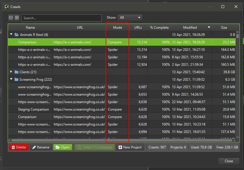 Nota: el Seo Spider utiliza el rastreo más reciente en orden de fecha como «Actual» y el más antiguo como «Anterior», pero puedes invertir la selección haciendo clic en la flecha situada junto al icono del engranaje en la parte superior de la interfaz.