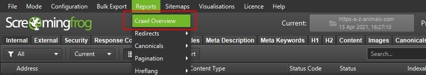 La Araña SEO comparará todos los datos del escaneado en las pestañas y filtros de la pestaña «Visión general» de la derecha.
