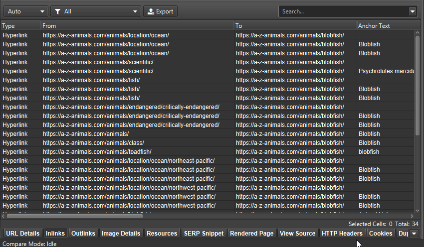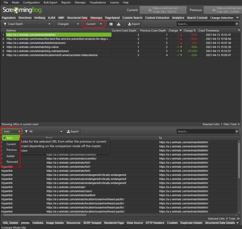 En nuestro ejemplo, la Araña Seo muestra los datos de enlaces del rastreo «actual», seleccionado en la ventana principal superior. Sin embargo, la ventana inferior puede configurarse independientemente para que muestre los datos de la exploración «anterior», aunque la ventana superior esté seleccionada para la exploración actual.