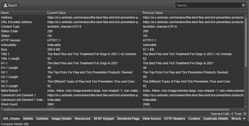 Otra posibilidad de comparación es consultar la ventana inferior de la Araña Seo, donde puedes ver los datos del escaneado comparándolos uno al lado del otro.
