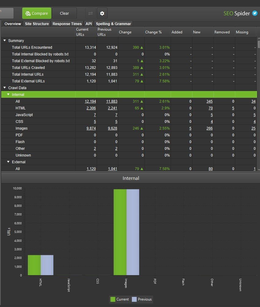 Basta con hacer clic en «Comparar» para iniciar la exploración entre los dos rastreos según las configuraciones de «Detección de cambios» establecidas de antemano.