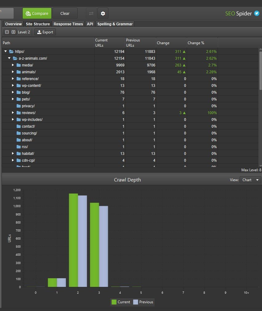 - Compara la estructura del sitio y los cambios en directorios, páginas y profundidad de rastreo entre rastreos.