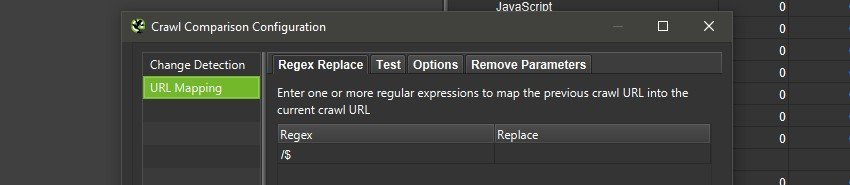 Por último, si las dos versiones a comparar sólo difieren por la barra final del subdominio, puedes utilizar «/$» en la asignación de URL.